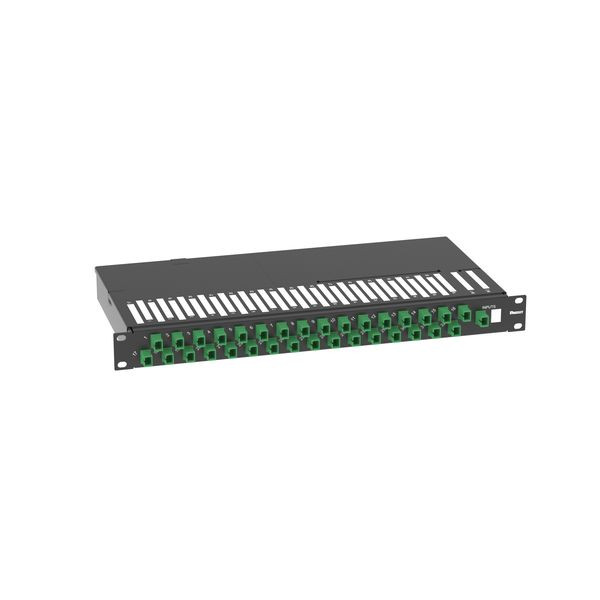 Das Splitter-Fach für die Montage im 19“ Rack belegt 1 RU und nutzt einen PLC (Planar Lightwave Circuit), um ein Signal für passive optische Netzwerke auf zweiunddreißig Signale aufzuteilen. Splitter-Fach mit einem SC-APC-Eingang und zweiunddreißig SC-APC-Ausgängen an der Gerätevorderseite.