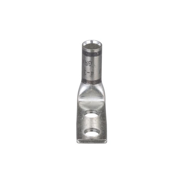 Zwei Löcher, Standardtrommelkabelschuh mit Fenster, Kabel Nr. 4 – Nr. 3 AWG STR, Nr. 2 AWG SOL, 1/4 Schraubloch, Lochabstand 0,63, Zunge 90-Grad-Winkel.