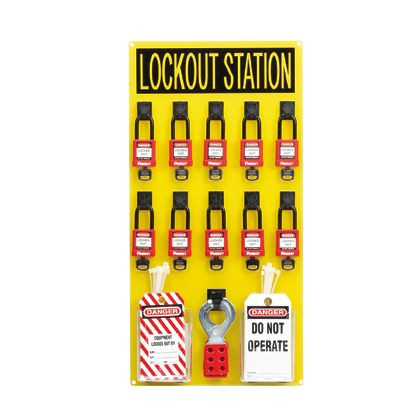 Verriegelungsstation mit Komponenten, 10 Personen.Enthaltene Komponenten:(10) PSL-8 rote nicht leitende Vorhängeschlösser (andere Schlüssel)(3) PSL-1.5 Verriegelungshaspen, (25 Anhänger) PVT-98 Sicherheitsetiketten 10 Anhänger) PVT-41 Sicherheitsetiketten