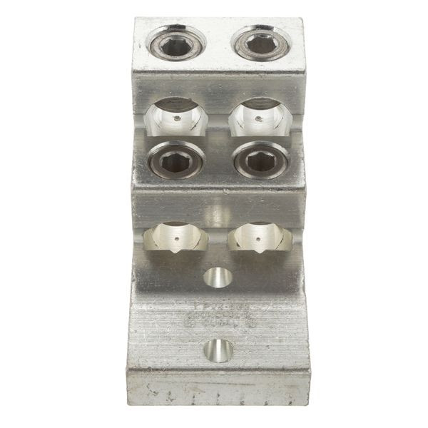 Zwei Löcher, Aluminium, Vierfach-Trommelkabelschuh vertikal, Typ LAM4SB, Nr. 2 AWG – 600 kcmil, Schraubloch 3/8 (9,5 mm).