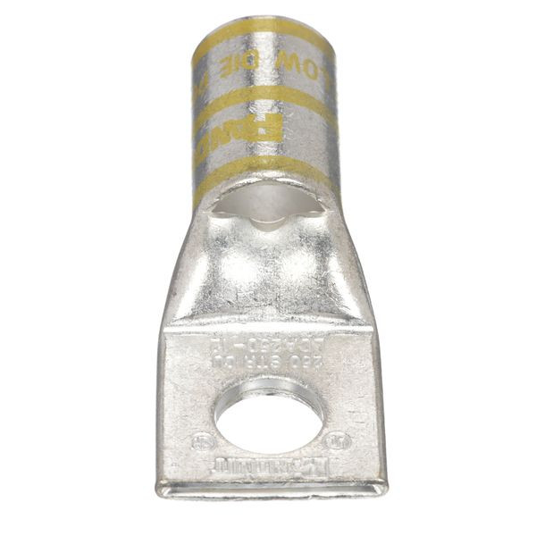 Der verzinkte Kupfer-Presskabelschuh LCA250-12-X, ein Loch, Standard-Barrel, verfügt über farbcodierte Barrels mit angegebenen Stempelindexnummern von Panduit und Wettbewerbern für die korrekte Auswahl der Crimpbacke. Ein Inspektionsfenster dient zur Sichtprüfung des Leiters auf richtigen Sitz und das verzinnte Material hemmt die Korrosion. UL-gelistet und CSA-zertifiziert bis 35 kV und UL-Temperaturbemessung 90°C.