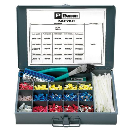 Der K2-PVKITY Industrie-Wartungssatz bietet einzelne Fächer zum Aufbewahren von Panduit Klemmen. Das Kit umfasst viele verschiedene Panduit Anschlüsse, Kabelbinder, Steckverbinder, Spleiße und Drahtverbindungen. Nach dem Schließen des Deckels bleiben die Produkte organisiert und in den Fächern.
