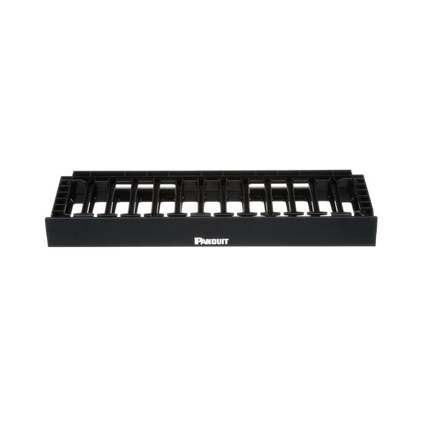 Die horizontale NetManager™ Kabelführung für hohe Kapazität organisiert und schützt kosteneffektiv Kupfer- und Glasfaserkabel in jedem standardmäßigen EIA 19" (483mm)-Rack oder Schrank. Große Öffnungen an den vorderen Fingern ermöglichen die komfortable Aufnahme von Kabeln der Kategorie 6 und 6A, wodurch sich Installationszeit und Instandhaltungskosten verringern lassen. Die Einseiten-Kabelführung ist 1 RU und verfügt nur über eine klappbare vordere Abdeckung. Die Führung ist schwarz.