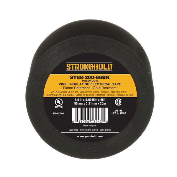 StrongHold ST88-200-66BK PVC-Isolierband, schwere Last, ist ein wetterbeständiges, druckempfindliches Isolierband, das sich leicht anbringen lässt und über viele verschiedene Temperaturen hohe Leistung bringt. Größe 2.0" x 66' x .0085", Farbe Schwarz, einzeln in Zellophan gewickelt. Geeignet als primäre Isolierung beim Spleißen von bis zu 600 V oder 80 °C (176 °F), Einsatz als äußere Schutzummantelung bei Anwendungen mit niedrigen Temperaturen möglich.