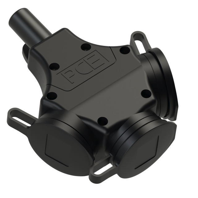 3-Wege Schutzkontaktkupplung Gummi mit Deckel (Deckelband) - schwarz; 16A 2p+E 250V IP44 (schwarz, nach franz./belg. System); Einsatz: Polyamid; innenliegende Zugentlastung; 3-polige Anschlussklemme; für erschwerte Bedingungen; Schutzart: IP44
