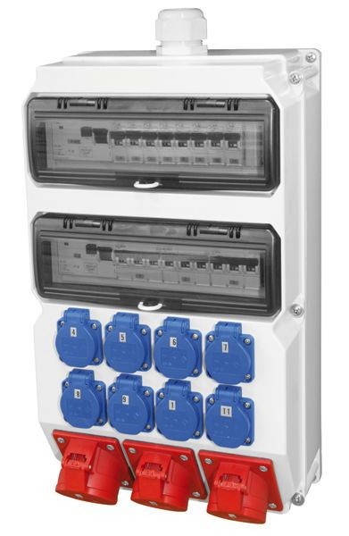 Kunstst.-Wandverteiler Modell SÖLDEN IP54 520x297x165 2x14TE BOT; 1xBohrung M40 oben, 1xBlindverschraubung M40 unten; 1xCEE-Steckdose 32A 5p 400V abgesichert ü. 1xLS 32A 3p C; 2xCEE-Steckdose 16A 5p 400V abgesichert ü. 2xLS 16A 3p C; 9xSK-Steckdose 16A 250V IP54 abgesichert ü. 9xLS 16A 1p C; 1xFI 63A/4/0.03A (TYP A 63AT) über alle Ausgänge; Leitungsschutzschalter und FI Fabrikat Eaton ÖVE / VDE; Verteiler auf HKL-Klemme (max.5x25qmm/5x16qmmYF!) verdrahtet