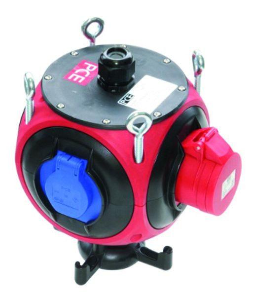 Kunstst.-Hängeverteiler Modell Pegasus IP44 140x140x240 0TE rot; 4xRingschraube oben M8x40 verzinkt; 1xM25 Verschraubung oben (Kabeldurchm. 13-18mm PG21) schwarz; 1xCEE-Steckdose 16A 5p 400V abgesichert d. Vorsicherung Zuleitung; 3xSK-Steckdose 16A 250V IP54 abgesichert d. Vorsicherung Zuleitung; Verteiler auf Vario-Connector 5polig 10qmm verdrahtet