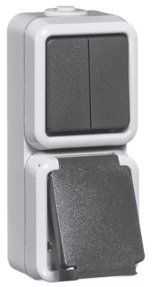 Oberflächenkombination, IP54, Steckdose mit Erde, 2-polig, Schalterreihe, grau