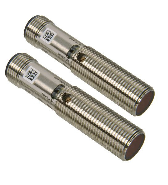 Einweg-Lichtschranke, Gewindebauform M12, Metallgehäuse, Lichtaustritt frontal, Reichweite 6 m, Rotlicht, Hell-/Dunkelschaltung, 1 NPN-Ausgang, Stecker M12, Robustes M12 Gewindegehäuse, Geringer Platzbedarf, Hell-/dunkelschaltend verdrahtungsprogrammierbar, Schutzart IP67