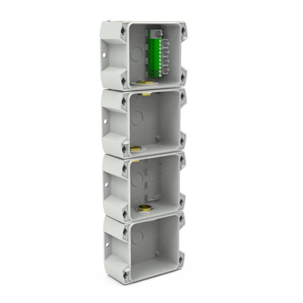 - Grundgehäuse (wie auch die Einsatzmodule) sind aus schlagfestem Polycarbonat gefertigt (IK 08) und sie sind spannungsneutral, erst die Moduleinsätze bestimmen die Spannungsversorgung
