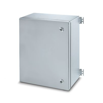 Leergehäuse, Material: Edelstahl 316L / 1.4404, Oberflächenwiderstand: gebürstet, silberfarben, 508 mm x 762 mm x 210 mm, Verschlussart: Tür mit wechselbarem Scharnier, Lieferumfang - ATD: Türscharnier mit Vierteldrehverschluss, Montageplatte, Doppelbartschlüssel, Befestigungswinkel mit Montageschrauben, Erdungsbolzen M12 außenseitig angebracht, Installationsanweisung, Türscharnier mit Vierteldrehverschluss