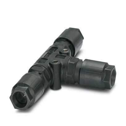 T-Verteiler, Anschlussart: IDC-Anschluss, Polzahl: 4+PE, 1 mm² ... 2,5 mm², 690 V, 20 A, PA, schwarz, mit drei QUICKON-Muttern, Kodierung: Kodierprofil, Leitungsaußendurchmesser: 9 mm ... 16 mm