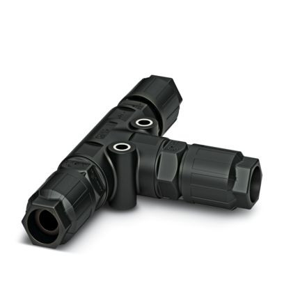 T-Verteiler, Anschlussart: IDC-Anschluss, Polzahl: 3+PE, 1 mm² ... 2,5 mm², 690 V, 20 A, PA, schwarz, mit drei QUICKON-Muttern, Kodierung: Kodierprofil, Leitungsaußendurchmesser: 9 mm ... 14 mm