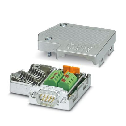 D-SUB-Stecker, 9-polig, Stift, zwei Kabelzuführungen unter 35°, Bussystem: für Inline Modbus RTU/ASCII Buskoppler Abschlusswiderstand über Schiebeschalter zuschaltbar, Pinbelegung: 3, 5, 6, 8; Schraubanschlussklemmen