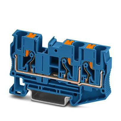 Durchgangsklemme, Nennspannung: 1000 V, Nennstrom: 41 A, Anzahl der Anschlüsse: 3, Anschlussart: Push-in-Anschluss, Bemessungsquerschnitt: 6 mm², Querschnitt: 0,5 mm² - 10 mm², Montageart: NS 35/7,5, NS 35/15, Farbe: blau