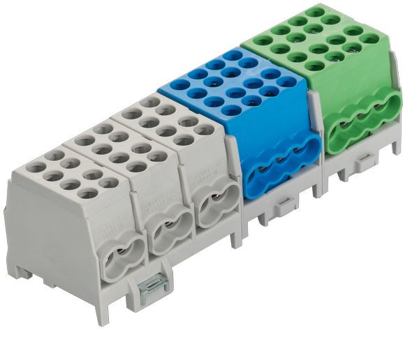 3 x grau, 1 x blau, 1 x grün, mehrpolig, Schnellbefestigung aus Stahlblech, Doppel-Schnellbefestigung bei 4- u. 5-pol., Minimodular kompatibel, VDE-zertifiziert