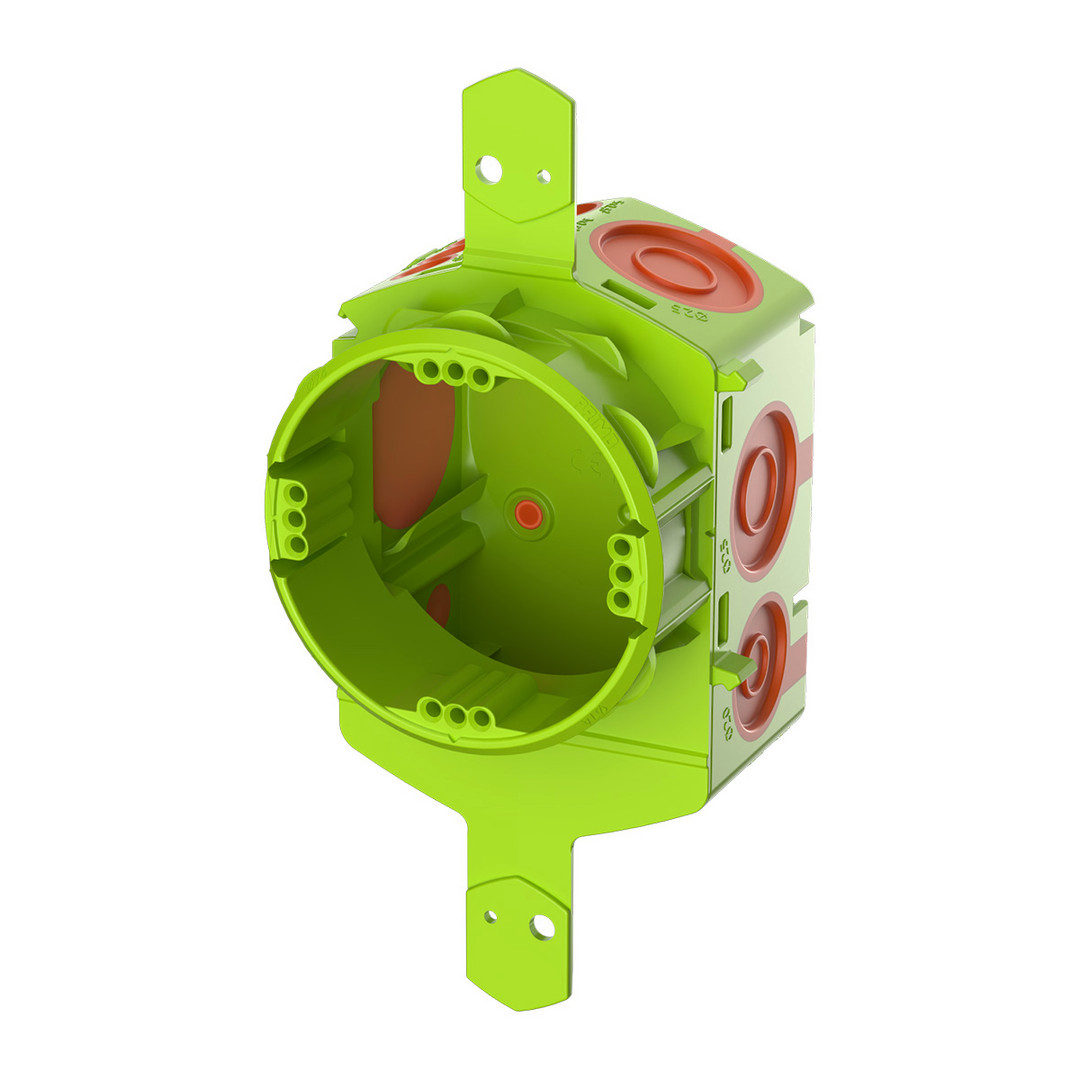 Die innovative und schnelle Möglichkeit zur Installation von Hohlwanddosen im Trockenbau. Die UniQ Hohlwand Geräte-V-Dose wird von hinten durch die Bohrung in Holzständerwänden oder Rigips gesetzt. Die Wand ist daher noch offen und Leitungen sowie Rohre können bequem eingeführt werden. Fixierungslamellen sorgen für den festen Halt im Baumaterial, zusätzlich kann die Geräteverbindungsdose über Nägel, Tacker oder Schrauben fixiert werden. Die halogenfrei und luftdichte Schalterdose bietet durch den Durchmesser von 74 mm, die sechseckige Bauform und der Tiefe von 73 mm deutlich mehr Klemmraum als andere Produkte. Außerdem können die Installationsdosen bei Mehrfachkombinationen im genormten Kombinationsabstand von 71 mm fest miteinander verbunden werden. Die SCS-Verbindungstechnik mit großflächiger Verbindungsmembran inklusive Cable-Plopp-Technik ermöglicht anschließend ein einfaches Durchverdrahten. Das verkürzt die Verarbeitungszeit zusätzlich. Drei Schraubdome auf allen vier Seiten garantieren die gerade Montage durch individuelle Ausrichtung der Geräte.