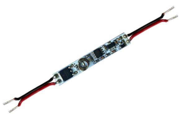 Kompakter Profil-Einbau-Sensor zur Steuerung von 12-24V-LED-Strips, ermöglicht Ein/Aus und Dimmen durch Profil-Antippen, bei 24V bis zu 72W steuerbar.
