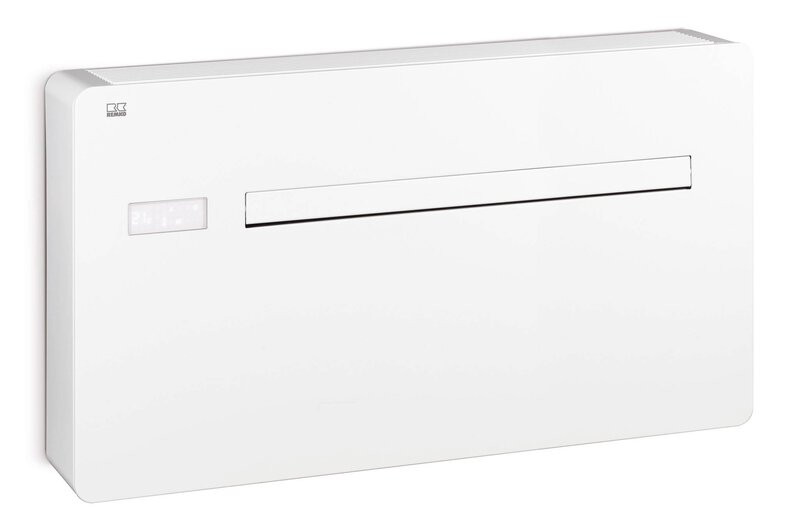 Lokales 2-Schlauch Klimagerät mit Inverter-Technologie in weiß zum Kühlen, Heizen, Lüften und Entfeuchten in kompakter Ausführung. Serienmäßig mit Wanddurchführung, Montageschiene,