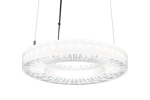 Pendelleuchte der IRIS-Produktfamilie. Lichtlenkung durch Abdeckung radialprismatisch, Ausstrahlungscharakteristik symmetrisch, breitstrahlend, Lichtaustritt direkt/indirekt. Leuchtmittel LED-M eingebaut, Austausch durch Fachkraft möglich. Die Leuchte generiert einen Bemessungslichtstrom von 4890 lm in Lichtfarbe 840, Lichtstrom einstellbar: Nein. Die hohe LED-Lebensdauer ermöglicht einen langen Einsatz bei gleichbleibender Beleuchtungsgüte. Hohe Lichtqualität durch eine Farborttoleranz von . Gehäuse aus Kunststoff, transparent, Schutzart IP20. Mit elektronischem Betriebsgerät On/Off. Austausch durch Fachkraft möglich. Nennspannung 220 - 240 V AC/DC 50 - 60 Hz.