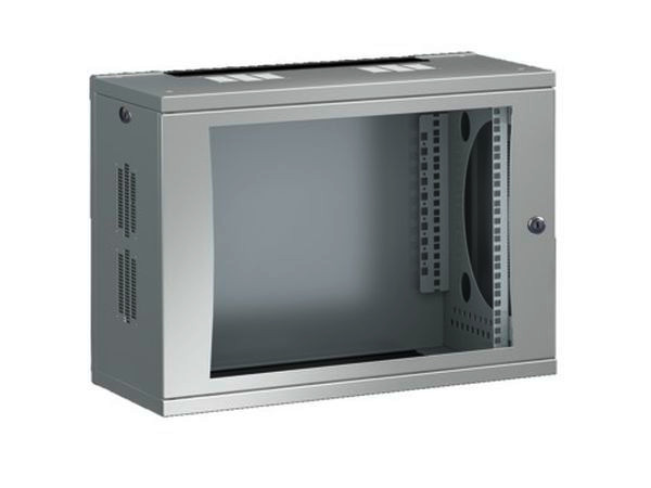 Oberfläche: Pulverbeschichtet in RAL 7035 DK FlatBox, Wand-/Standgehäuse in FlatPack-Verpackung, mit 482,6 mm (19")-Profilschienen, 9 HE, BHT: 600x492x400 mm