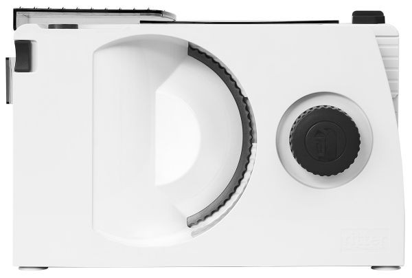 stufenlose Schnittstärkeeinstellung, Wellenschliffmesser, abnehmbarer und teilbarer Schlitten zur platzsparenden Aufbewahrung auch am geklappten Gerät, Schlittenweg ca. 20 cm, Sicherheits-Sicherheits-2-Finger-Einschaltsystem, klappbarer Auflegetisch, zusammengeklappt nur 10,5 cm breit