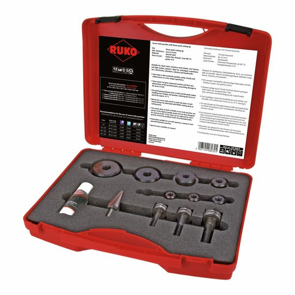 Mit wenigen Handgriffen dünnwandige Materialien schnell, mühelos, sauber und gratfrei lochen. Das Kugellager macht die Handhabung noch leichter und schneller. Der Kraftaufwand wird um ca. 67 % verringert. Besonders gut geeignet für den Einsatz mit Schraubenschlüsseln, Handhydraulikstanzen oder Fußhydraulikstanzen. 12-teiliger Schraublochstanzen-Satz 7 Schraublochstanzen Ø 16,5 (M 16) - 20,4 (M 20 / PG 13,5) - 25,4 (M 25) - 32,5 (M 32) - 40,5 (M 40) - 50,5 (M 50) + 63,5 mm (M 63) + 1 Blechschälbohrer HSS Gr. 2 + 1 Schneidpaste 30 g + 1 Zugschraube MF 10 x 1,0 x 45 + 1 Zugschraube MF 12 x 1,5 x 55 + 1 Zugschraube MF 16 x 1,5 x 60