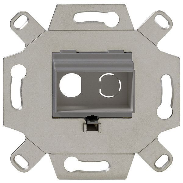 Montageadapter, ST, 2-fach, mausgrau (ähnlich RAL 7005), für TAE-Abdeckungen; - Tragadapter aus Zinkdruckguss; - abbrechbarer Tragring für Stegversion; - metrische Schrauben für Zentralstücke; - Montage optimal in Verbindung mit Kaiser-Electronicdose (oder vergleichbar); - passend zu TAE-Designabdeckungen der Schalterindustrie (Berker, Busch-Jaeger, GIRA, Jung, Merten, usw.)