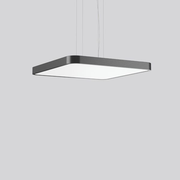 Dekorative quadratische LED Pendel-Flächenleuchte. Flacher nahtloser Rahmen Aluminium-Strangpressprofil pulverbeschichtet. Abdeckung Stahlblech pulverbeschichtet. Baldachin Aluminium pulverbeschichtet. Direkter Lichtaustritt über Diffusor aus vergilbungsfreiem Kunststoff (PMMA) opal.Indirekter Lichtaustritt über flächenbündigen Diffusor aus Kunststoff satiniert. LED Backlight-Technologie für eine homogene Ausleuchtung der gesamten lichtabgebenden Fläche. Lichtaustritt direkt 70%, indirekt 30%. 4-Punkt Stahlseilabhängung stufenlos höhenverstellbar. Einfache Montage mit transparenter, kürzbarer Pendelleitung und Baldachin mit Magnetbefestigung. DALI-Betriebsgerät zum steuern, schalten und dimmen integriert. Lichtaustritt direkt/indirekt getrennt schalt, und regelbar. Für Durchgangsverdrahtung geeignet.