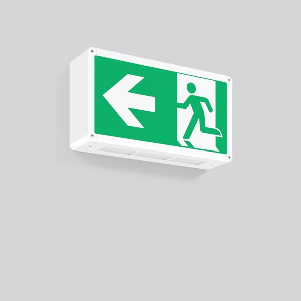 Leuchte zur Rettungswegkennzeichnung. Gehäuse Aluminium mit Eckverbindungen Kunststoff. Kunststoffscheibe opal mit Rettungszeichen einseitig. Betriebsgerät integriert. Zum Anschluss an zentrale Sicherheitsstromversorgung geeignet.