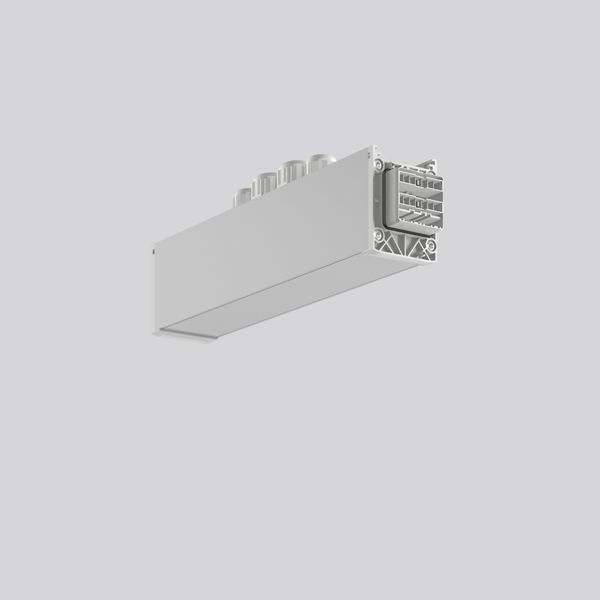 Mitteleinspeisung, 7-polig, Anschluss Buchse / Stecker. Gehäuse Aluminium-Strangpressprofil eloxiert. Abdeckung Kunststoff in Gehäusefarbe. LINEDO Steckersystem aus Kunststoff hellgrau. 4 Kabelverschraubungen (2 x M20 und 2 x M25). Kabelverschraubungen oben. Komfortabler Anschluss für starre und flexible Leitungen.