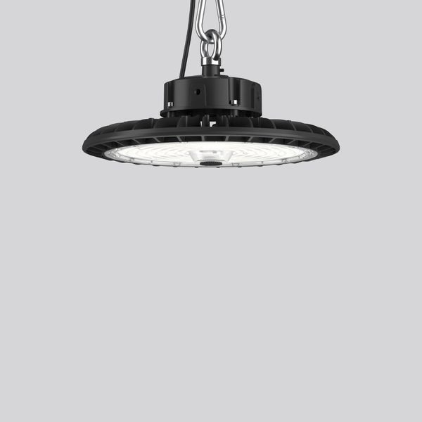 Flacher runder Hallenstrahler für Ketten, oder Seilabhängung. Gehäuse Aluminium-Druckguss pulverbeschichtet. Diffusor Kunststoff (Polycarbonat), schlagzäh. MultiLumen: Einstellbarkeit des Leuchtenlichtstroms in 3 Stufen. Werkseitig höchster Leuchtenlichtstrom eingestellt. Einfache Installation durch Ein-Punkt-Aufhängung. Pendelabhängung über Kette oder Stahlseil bauseits. Mit 3-poliger Anschlussleitung (300 mm). Leuchte mit begrenzter Oberflächentemperatur nach DIN EN 60598-2-24 zur Verwendung in einer Umgebung, in der eine Ablagerung von leitfähigem Staub auf der Leuchte erwartet werden kann.