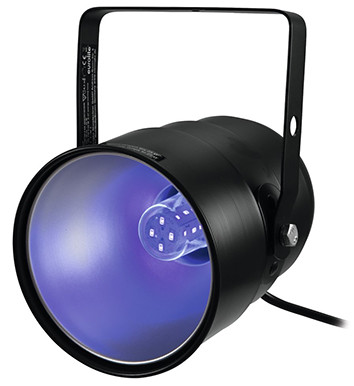 LED UV-Strahler 210x180x250mm schwarz Strahler mit E27-Sockel inklusive 5W-UV-LED (1 x SMD 5W UV, homogene Farbmischung, 396 nm), robustes Metallgehäuse mit Montagebügel, hochwertiger Reflektor, anschlussfertig über Netzleitung mit Schutzkontakt-Stecker, Ansteuerung: Stand-alone, ideal für Show-Effekte, weiße Textilien sowie UV-aktives Material leuchten in der Dunkelheit. Spezialprodukt: das verwendete Leuchtmittel ist nicht zur Raumbeleuchtung in Haushalten vorgesehen. Energieeffizienzklasse: nicht kennzeichnungspflichtig Quecksilbergehalt (mg): 0