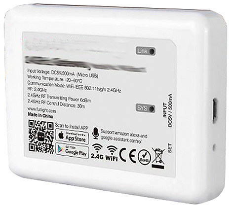 WiFi Controller für RGB-CCT Produkte WiFi/WLAN Controller inkl. USB Stromkabel (ohne Netzteil), 2.4GHz Gateway, WLAN Box, Input: DC5V/500mA (Micro USB), Communication Mode: WiFi-IEEE 802.11b/g/n 2.4GHz, RF: 2.4GHz, 6dBm