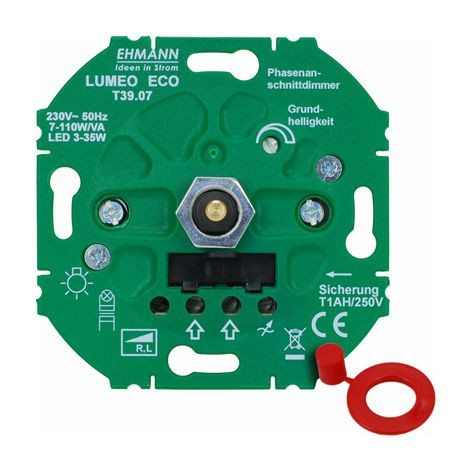 LED Unterputz-Dimmereinsatz Flackerfreies Dimmen durch Einstellmöglichkeit der Grundhelligkeit. LED-Leistung: 3-35W. Kein Stand-by Verbrauch durch einen echten Ein-/Aus Schalter. Kurzschlussschutz mittels Feinsicherung (Ersatzsicherung inklusive). Mit Druck-Wechsel-Schalter. Geeignet für dimmbare LED Leuchtmittel, NV-Halogenlampen mit magnetischem Trafo, Glüh- und HV-Halogenlampen, Lastart LED, R, L. Schraubklemmen bis 2x2,5mm² (starr). Kompatibel mit gängigen Schalterprogrammen von Gira, Busch-Jäger, Berker und Jung durch mitgelieferten Adapter.