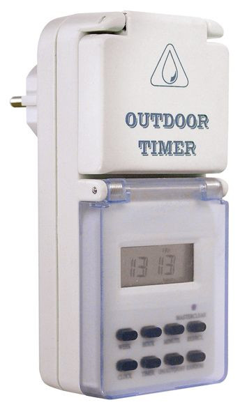 Wochen-Zeitschaltuhr digital Digitale Zeitschaltuhren sind durch ihre hochwertigen digitalen Zeitmesser minutengenau programmierbar und verfügen über ein großes, gut ablesbares Display. Spritzwassergeschützte Zeitschaltuhren für die Benutzung im Außenbereich zeichnen sich durch ein sehr robustes Gehäuse und eine spritzwassergeschützte (IP44) Schutzkontaktsteckdose aus. Sie eignen sich für Feuchträume in denen z.B. Wäschetrockner oder Waschmaschinen untergebracht sind, sowie bei geschützter Anbringung für Geräte im Außenbereich (z.B. Garten oder Teichbeleuchtung, Außenbeleuchtung, etc.