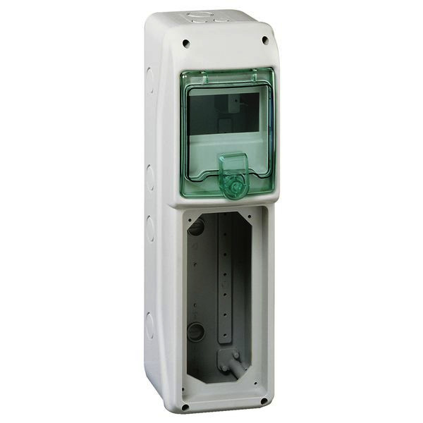 Kaedra wetterfestes Aufputzgehäuse mit der Möglichkeit von verschiedenen Einbauten, 1 Montagestellen für verriegelbare Steckdose 103x225mm, 5 TE für Reiheneinbaugeräte. IP-Schutzklasse - IP65. Es können alle Arten von modularen Reiheneinbaugeräte installiert werden und es gibt Platz für die installation von Industriesteckdosen. Das Gehäuse ist mit einer transparenten grünen Tür für modulare Reiheneinbaugeräte ausgestattet. Die Farbe des Gehäuses ist hellgrau (RAL 7035). Es ist für die Neuinstallation oder Renovierung in Zweckgebäuden oder auch vielen anderen Bereichen z.B. Industrie vorgesehen. Die Kabel können über vorgestanzte Öffnungen an der Ober- oder Unterseite des Gehäuses eingeführt werden. 1 Klemmenblock wird mitgeliefert. Die Anschlussklemmen haben 4 Abgänge (2x10mm² + 2x16mm²). Das Gehäuse hat die Schutzklasse II und ist bis zu einem Nennstrom von 63A zugelassen.