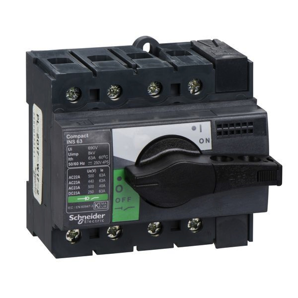 Compact INS63 ist ein 4-poliger, nicht selbsttätiger Lasttrennschalter 63A mit schwarzem Drehgriff.
