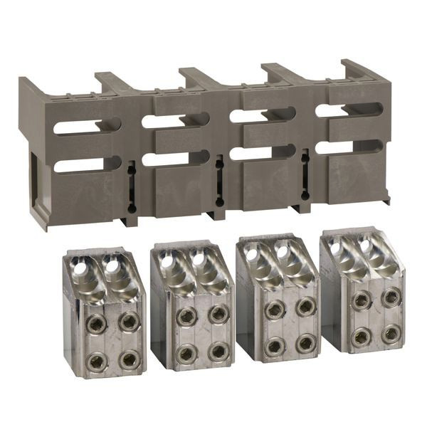 Bei diesem Zubehör handelt es sich um einen speziellen Satz von blanken Kabelsteckern und Klemmenabschirmungen für 4-polige, fest frontal angeschlossene ComPact NSX 630b-1600. Die blanken Kabelanschlüsse können bis zu vier 240mm² Kupfer- oder Aluminiumkabel aufnehmen. Die Klemmenabschirmung isoliert die Stromanschlusspunkte. Der Nennstrom beträgt bis zu 1250 A. Sie werden als 4-teiliger Satz verkauft.