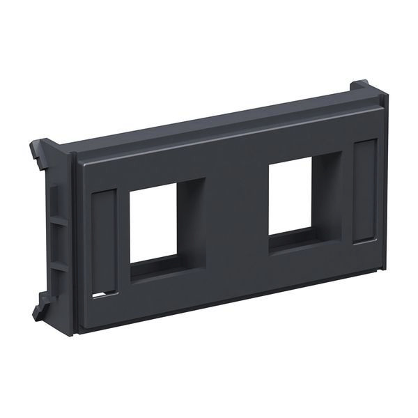 Montageplatte mit Schriftfeld, 2XAMP 110 CONN. BU. grau RAL7021 Typ:CYB-DP. Das CYB-Niederspannungs-Installationszubehörsystem ist für Installationsträger mit F80-Frontöffnung ausgelegt. Zusätzlich kann es an der Wand oder in einer Gerätedose montiert werden. Das System ist rahmenlos und ohne Dose und besteht aus Abdeckungen zum Aufrasten mit Montageplatten und Steckverbindern. Die Abdeckungen sind in abgeschrägter oder flacher Ausführung erhältlich. Die CYB-BK-Einbaukits enthalten Montagerahmen, Abdeckung und Schriftfeld. In Kombination mit verschiedenen Befestigungsblechen und Steckverbindern stellen die Einbaukits komplette Anschlusskits dar.