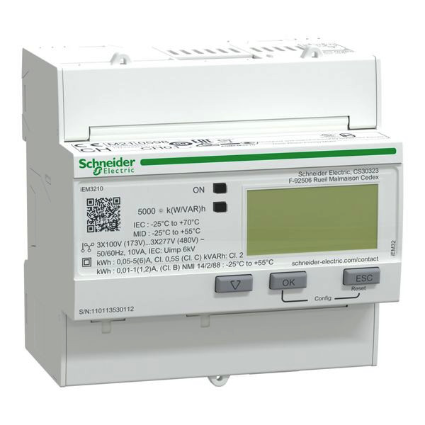 mit S0-Impulsausgang und MID Der Energiezähler iEM3210 ist ein attraktives Angebot für einen dreiphasigen Energiezähler für die DIN Schienenmontage mit LCD Display. Die zusätzliche lokale Signalisierung umfasst eine grüne LED Einschaltanzeige, eine blinkende gelbe LED für die Genauigkeitsprüfung und Kommunikationsanzeigen. Dieser Zähler kann in Weiterverrechnungs- und Teilabrechnungsanwendungen verwendet werden. Der Zähler bietet die folgenden Genauigkeitsklassen: Wirkenergie: Klasse 1 nach IEC 62053-21, Wirkenergie: Klasse B nach EN 50470-3 und Wirkenergie: Klasse 1 nach IEC 61557-12. Der Zähler misst Wirk- und Blindleistung, Wirk- und Blindenergie. Entwickelt für 50Hz oder 60Hz Netze, die Versorgungsspannung kann von 100 bis 277VAC oder 173 bis 480VAC variieren. Der Bemessungsstrom fließt durch einen 1A oder 5A Stromwandler, um in diesem Zähler gemessen zu werden und unterstützt einphasige und neutrale, dreiphasige und dreiphasige und neutrale Konfigurationen. Keine primären Kommunikationsanschlüsse. Es gibt einen digitalen Impulsausgang für die Energieerfassung. Zertifizierungen umfassen EAC, CE, UL und MID. Die Produktabmessungen sind wie folgt: Breite 90 mm, Tiefe 69 mm, Höhe 95 mm und Produktgewicht 260 g.