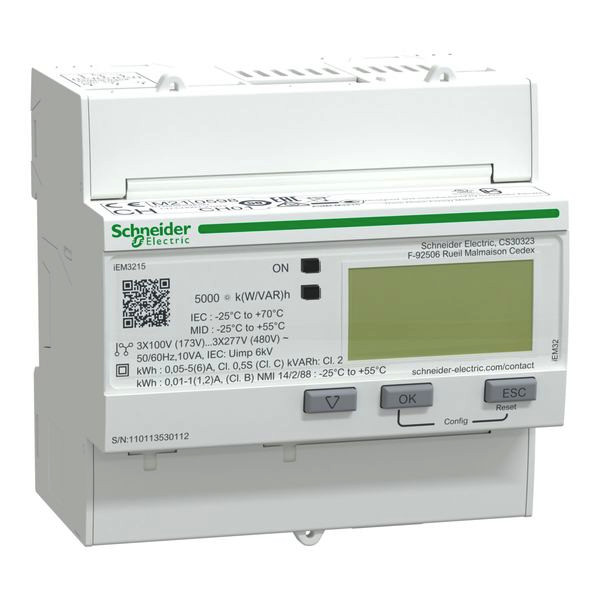 | Kurzbeschreibung | Energiezähler iEM3215, 3-phasig, 1A/5A, mit Teilzähler, 2E, Multi-Tarif, MID konform, Genauigkeitsklasse 1/0,5s |