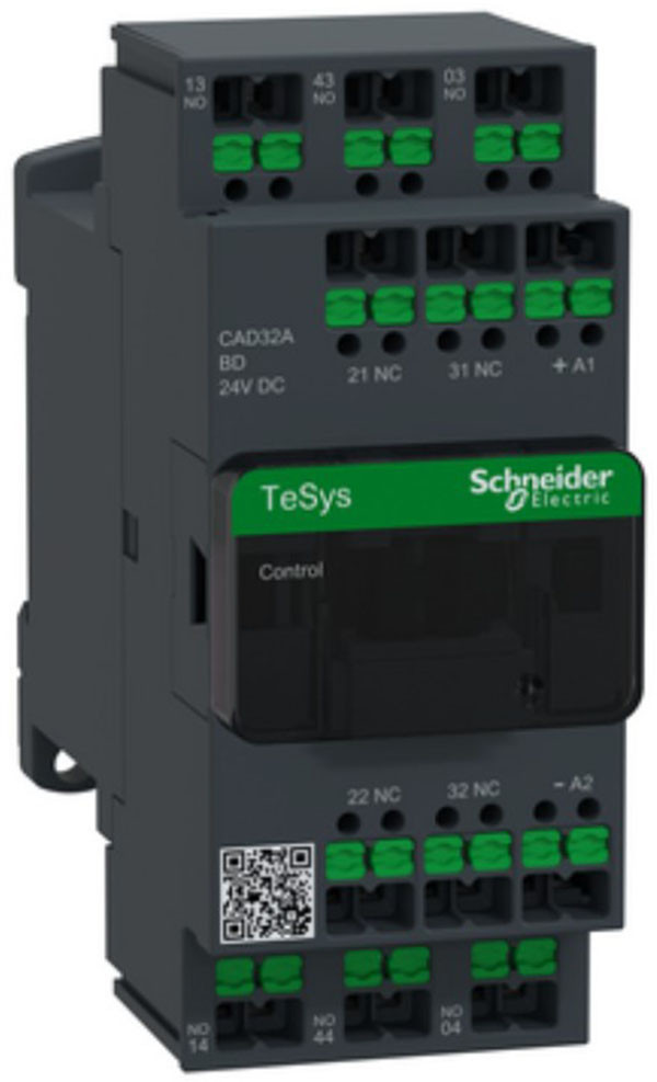 Hilfsschütze TeSys Control CAD. Hilfsschütz für die Gebrauchskategorien AC-15 bis 690V und DC-13 bis 440V. Es bietet 5 Kontakte (3S + 2Ö), eine 24 V DC Spule. Für anspruchsvolle Anwendungen mit hohen Betriebsgeschwindigkeiten bis zu 10800 Zyklen/Stunde sorgt er für hohe Zuverlässigkeit und Haltbarkeit. Fünf integrierte Hilfskontakte, erweiterbar um bis zu neun Hilfskontakte. Schnelle, sichere und wartungsfreie Stromverbindung mit SnapIN Anschlussklemme. Geeignet für Sicherheitsanwendungen durch mechanisch gekoppelte Kontakte und Spiegelkontakte.