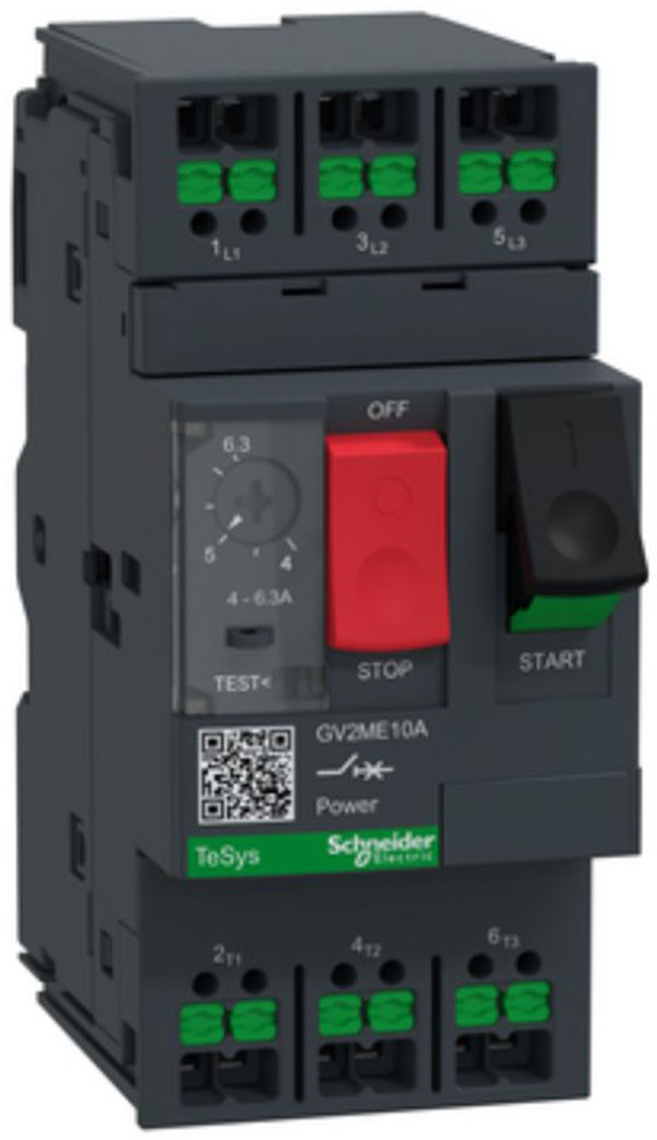 TeSys Power Motorschutzschalter. Motorschutzschalter, 3P. Bemessungsleistung 2,2 kW, Einstellbereich 4-6,3 A. Mit thermischen und magnetischen Auslösern. In der Grundausführung plombierbar und abschließbar. Betätigung über Taster. Bemessungsspannung 400 V, nach AC-3. Schnelle, sichere und wartungsfreie Stromverbindung mit SnapIN Anschlussklemme. Geeignet für Sicherheitsanwendungen durch mechanisch gekoppelte Kontakte und Spiegelkontakte.