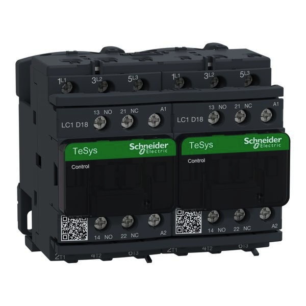 Anschluss: Schraubklemmen TeSys D ? 3-polige Wendeschütze. Wendeschützkombination, 18A, Spule. Anschluss Schraubklemmen, Bemessungsleistung 7,5 kW, Kontakte 1 S + 1 Ö, MTZ 13. Gerätebreite 90 mm bis 40 A, Schraub- und Schnappbefestigung. 3-polig, je zwei integrierte Hilfskontakte, erweiterbar um bis zu je vier Hilfskontakte. Steuer- und Leistungsebene räumlich und farblich getrennt. In der Grundausführung plombierbar. Hauptstromverdrahtung bereits durchgeführt. Bemessungsspannung 400 V, nach AC-3. Wechselspannungsbetätigt 230 V 50/60 Hz.