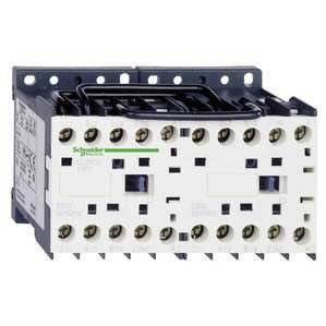 Wendeschütz TeSys K, Anzahl Pole: 3 Schliesser, Hilfsschalter: 1 Schliesser, Bemessungsbetriebsstrom AC-3: 9 A, Steuerspannung: 220V 50/60 Hz, Mittlere Leistungsaufnahme: Anzug 30 VA, Halten 4,5 VA, Schutzbeschaltung aufrastbar, Anschlüsse: Schraubklemmen, Abmessungen: (BHT) 90 x 58 x 57 mm, optionales Zubehör aufrastbar, Zulassungen: UL, CSA, u. a..