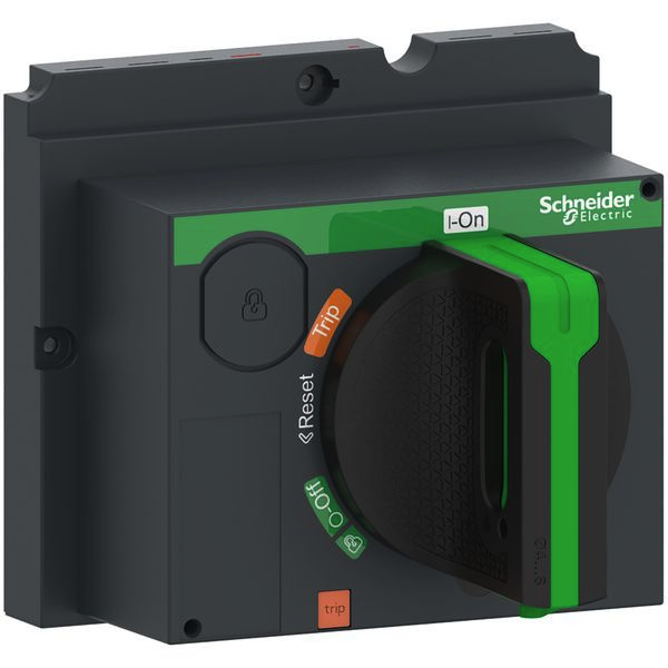 Es ist ein direkter Drehantrieb für die Geräte ComPacT NSX 100/160/250, PowerPact Multistandard H/J und EasyPact CVS 100/160/250. Es eignet sich für die galvanische Trennung und wird für Standardanwendungen verwendet. Es behält den Zugriff auf die Einstellungen des Auslösegeräts und auf den Auslösetaster bei. Er ist mit einem schwarzen Standardgriff ausgestattet. Es gibt eine Anzeige der drei Gerätepositionen O (AUS), I (EIN) und ausgelöst. Die Schutzarten sind IP40 und IK07. Dieser Drehantrieb kann in der Stellung AUS mit 1 bis 3 Vorhängeschlössern verriegelt werden (Bügeldurchmesser 5 bis 8 mm). Optional ist es möglich, einen Schlüsselschalter Ronis oder Profalux auf der Unterseite des Griffs zu installieren, um die gleiche Funktion zu erhalten wie bei einem Vorhängeschloss.