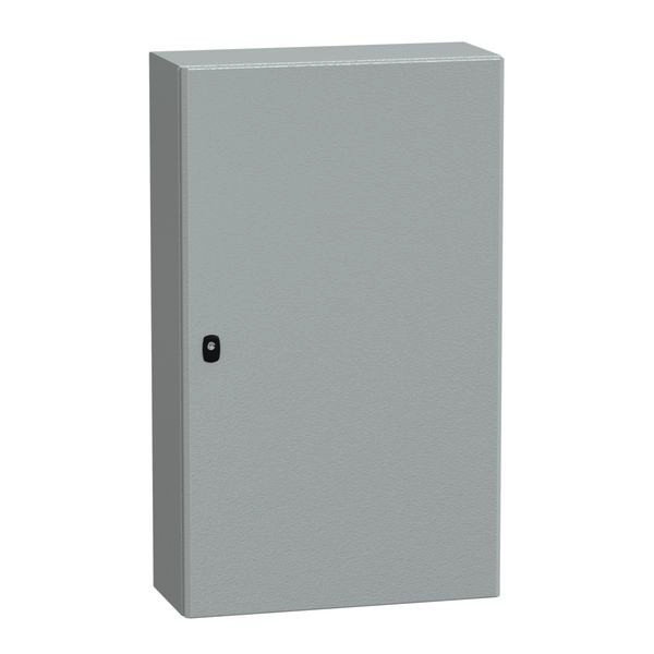 PanelSeT S3D Wandgehäuse aus Stahl mit Volltür. Einteiliger Körper, ohne Montageplatte. 3-Punkt-Verschlusssystem mit Griff und 3 mm Doppelbartschliessung. Aus Stahl, Epoxid-Polyester-Pulverbeschichtung. Schutzart IP 66, IK10, Farbe RAL 7035. 1 Kabelverschraubungsplatte im Lieferumfang enthalten, Standard.