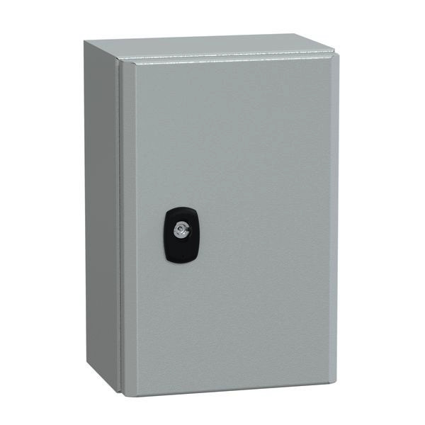 PanelSeT S3D Wandgehäuse aus Stahl mit Volltür. Einteiliger Körper, ohne Montageplatte. 3-Punkt-Verschlusssystem mit Griff und 3 mm Doppelbartschliessung. Aus Stahl, Epoxid-Polyester-Pulverbeschichtung. Schutzart IP 66, IK10, Farbe RAL 7035. 1 Kabelverschraubungsplatte im Lieferumfang enthalten, Standard.