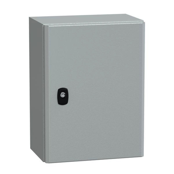 PanelSeT S3D Wandgehäuse aus Stahl mit glatter Tür. Einteiliges Gehäuse, inkl. Montageplatte. 3 mm Doppelstabschloss-Einsatz. Aus Stahl, Epoxid-Polyester-Pulverlackierung. Schutzart IP 66, IK10, Grau RAL 7035.